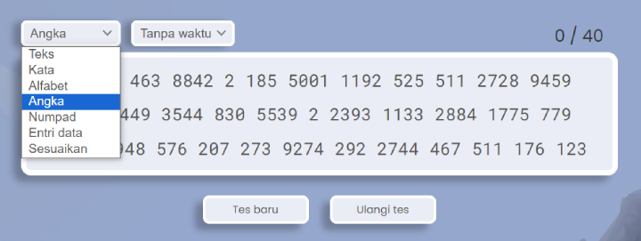 Tes mengetik angka kami berfokus pada membantu Anda membangun ketepatan dan kecepatan dengan input numerik. Apakah Anda sedang mempersiapkan untuk entri data atau hanya ingin mengasah keterampilan Anda, jenis tes ini adalah cara yang bagus untuk berlatih dan meningkatkan kecepatan mengetik Anda secara keseluruhan. Pilih "Angka" dari pemilih jenis tes dan tantang diri Anda dengan tes mengetik khusus angka untuk meningkatkan kemampuan Anda.